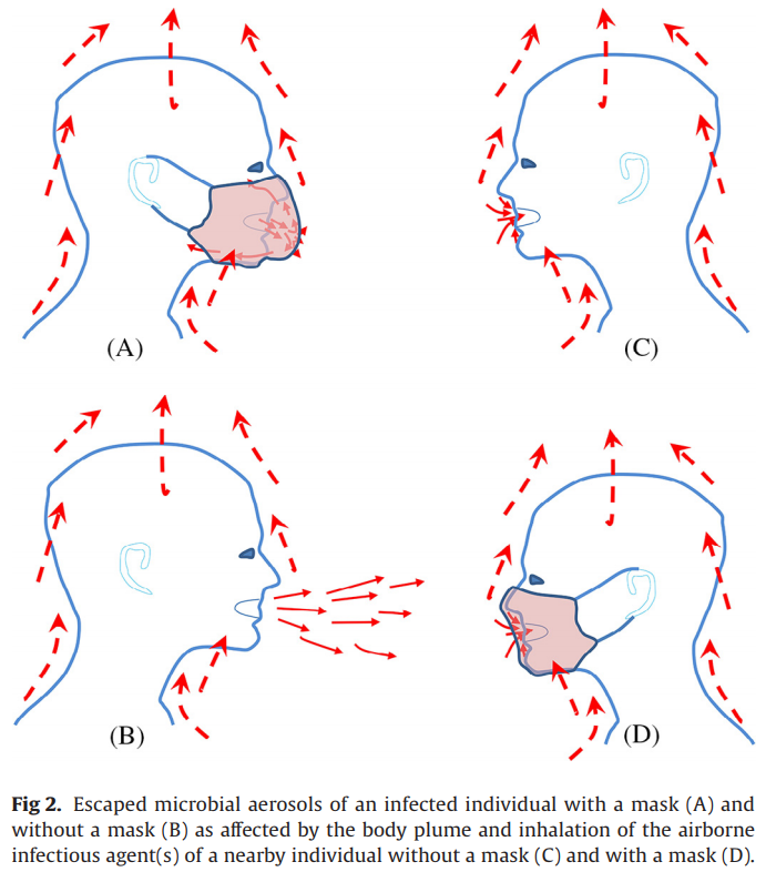 그 틈을 통한 공기흐름을 타고 새어나간 작은 방울들이 인체 주위의 열기류나 주변 기류를 타고 나가게됩니다.